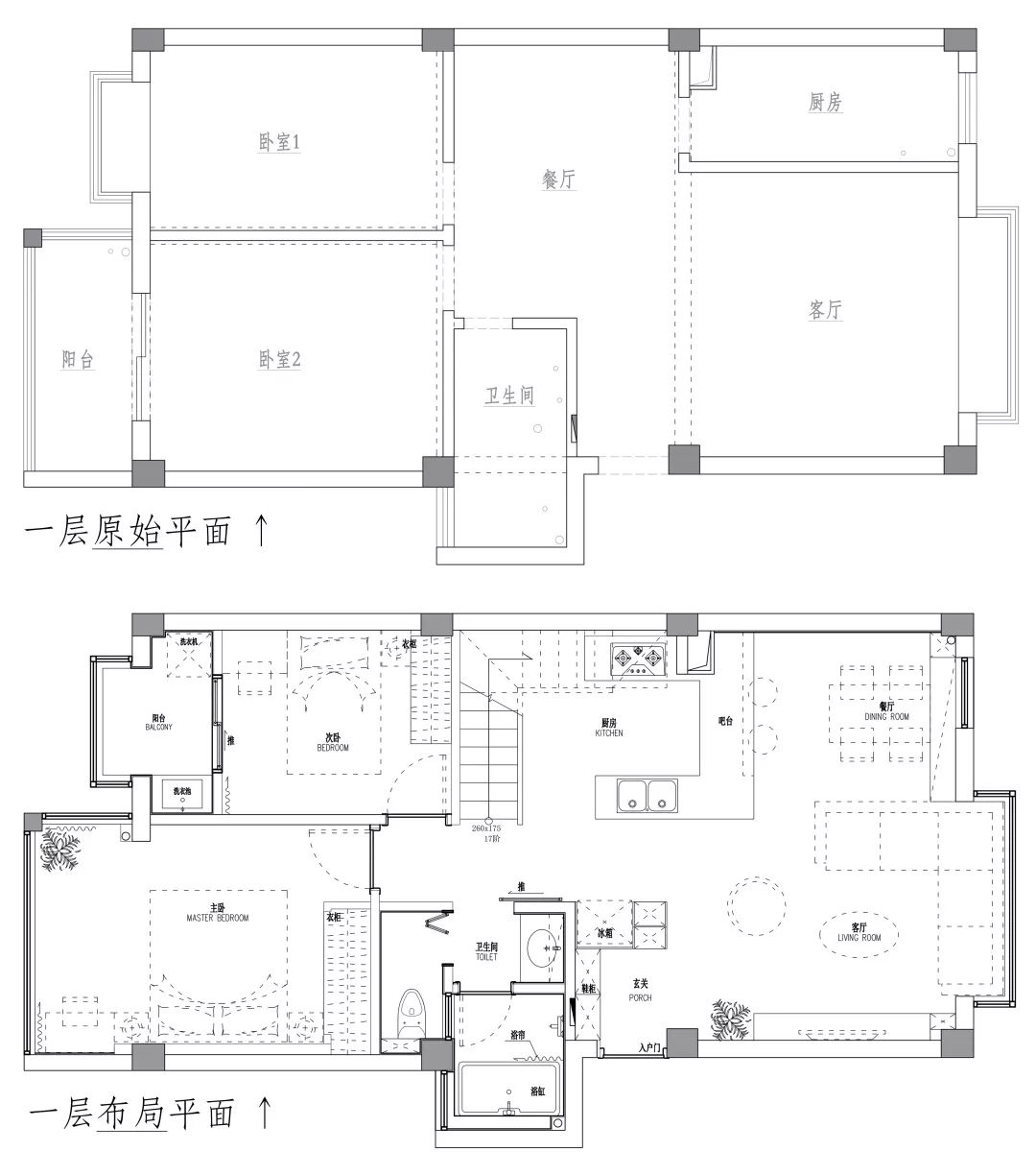 一樓設計上,根據業(yè)主的居住需求,拆除部分非承重墻,重新布局功能區: