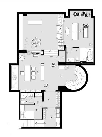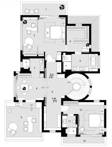 餐廳對面是簡(jiǎn)約的弧形樓梯,原木色的踏步與黑色元素的組合,產(chǎn)生自然與前衛的強烈對比,并在燈光和充足的自然光下貫穿三層空間,靈動(dòng)而時(shí)尚。走在樓梯上看戶(hù)外的景色,更是讓人心情舒暢。