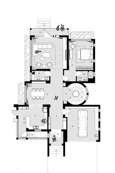 別墅進(jìn)門(mén)玄關(guān)設置在客廳最南端,墻面通過(guò)方圓結合的窗體形成立面造型,同時(shí)營(yíng)造出不同的光影效果。讓空間開(kāi)放,讓視覺(jué)延伸,讓胸懷開(kāi)闊,這是我對玄關(guān)的一種表達。
