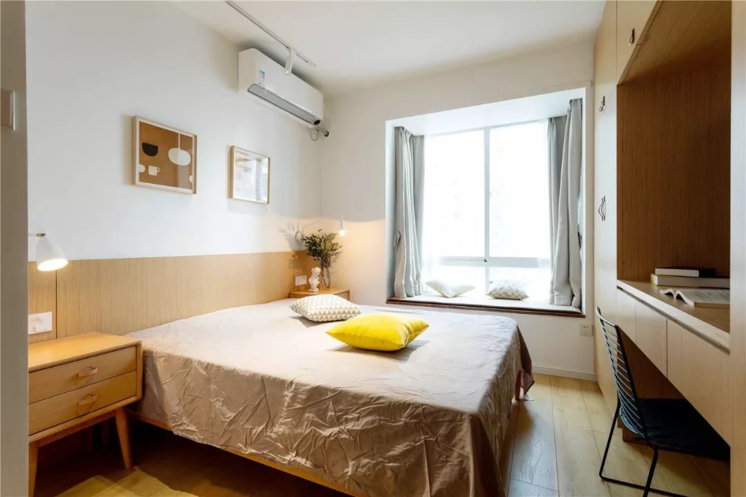 主臥仍是簡(jiǎn)潔溫馨的調調,以木飾面替代了床頭,節省了床頭的位置留出足夠通行的距離。