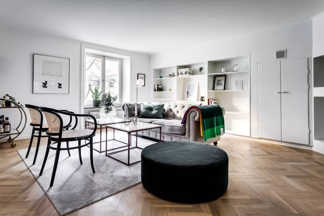 下圖的案例中,屋主沒(méi)有像傳統一樣讓沙發(fā)直接僅靠墻壁,而是在沙發(fā)后面的墻面空間打造了嵌入式儲物柜,不僅最大限度地利用了墻面空間,同時(shí)也擴大了視覺(jué)上的美感。
