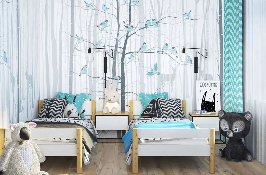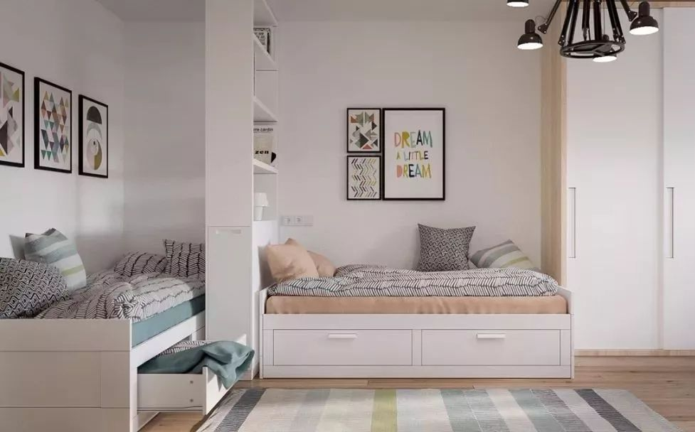 若是房間比較方正,可以設計為并排的兩個(gè)小床,兩個(gè)床中間搭配一個(gè)床頭柜,柜上既可以擺放裝飾品,同時(shí)也令兩個(gè)床鋪區分開(kāi)。
