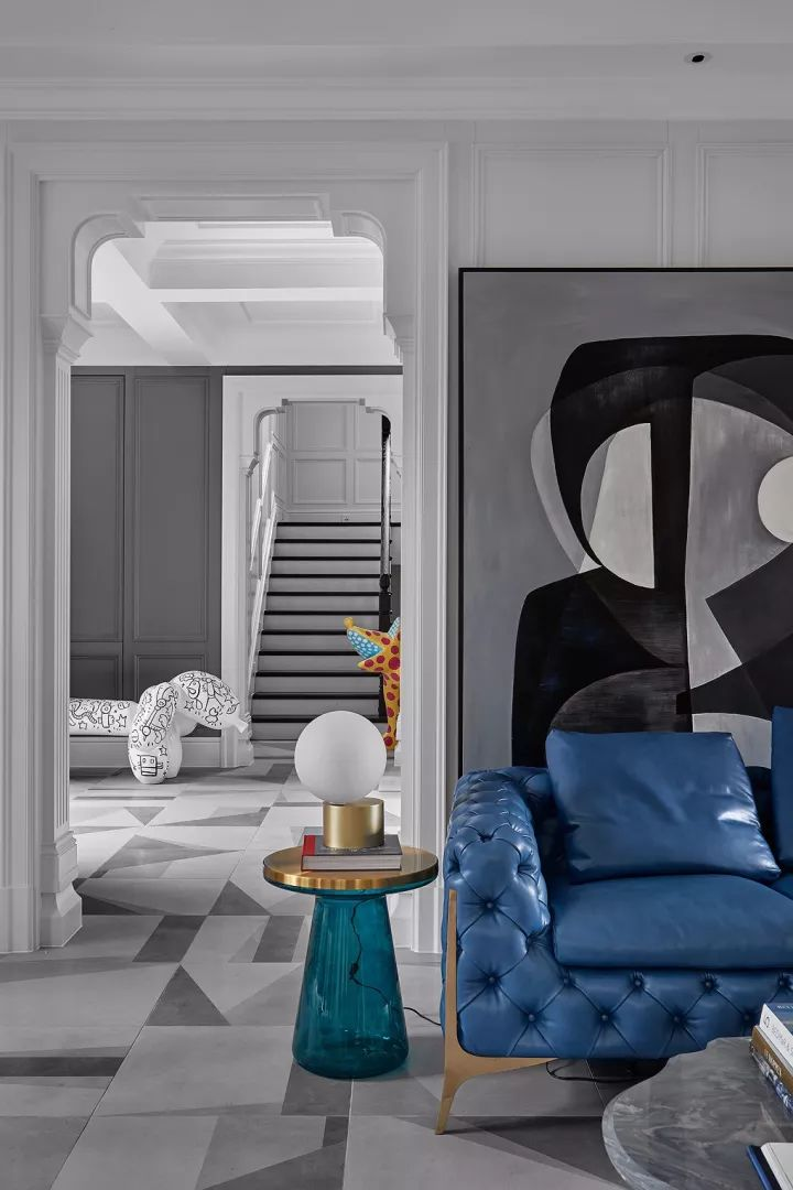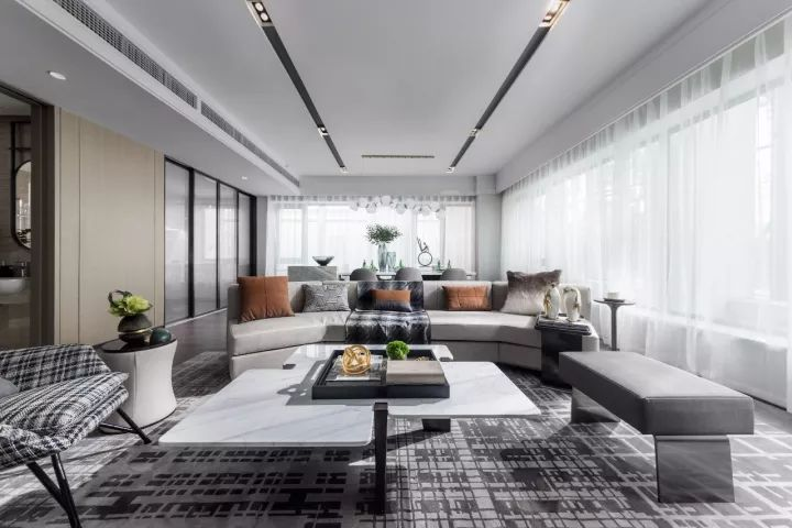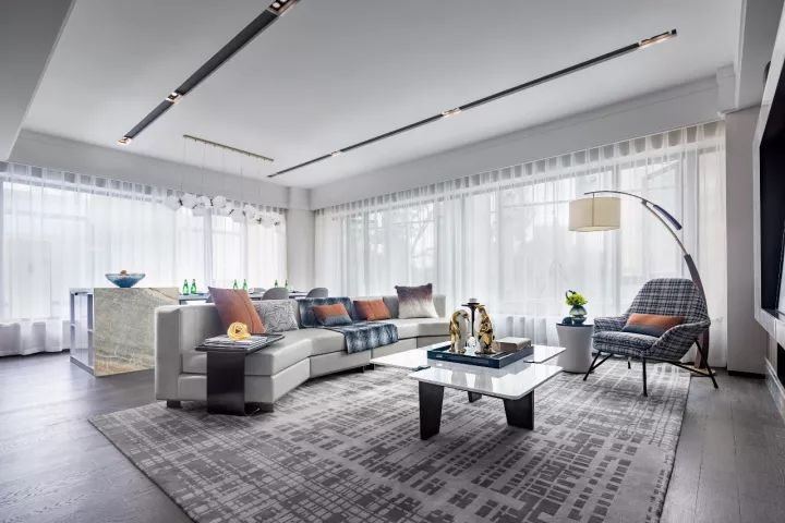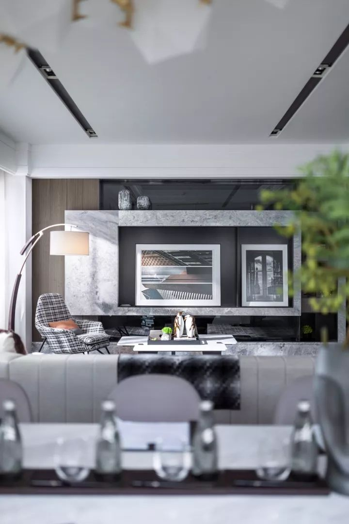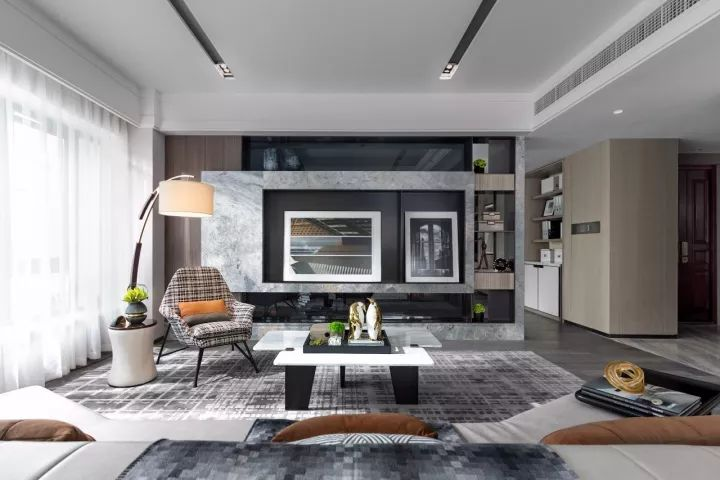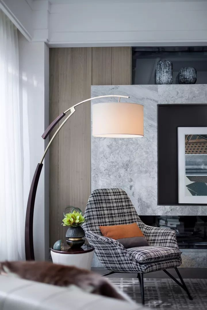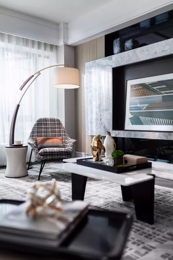 設計師用現代簡(jiǎn)約設計手法來(lái)鋪陳空間,大面的落地窗擁有極佳的視野,黑白灰色調的運用賦予了空間獨特的雅韻和品質(zhì)感。經(jīng)典的格紋透露出些許英倫情調。