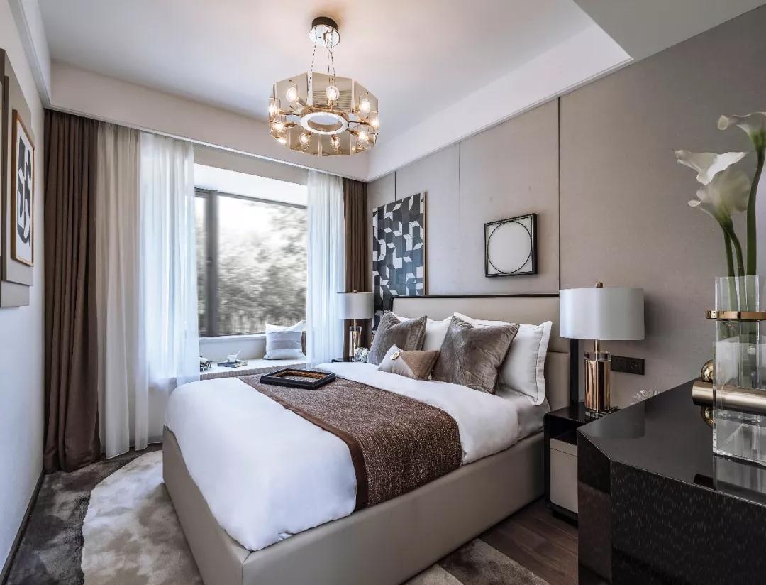私人空間的設計,講求私密性和舒適感,主臥不僅空間尺度舒怡,吊頂豐富而精致,與墻面簡(jiǎn)歐護墻互相呼應,提升空間整體飽和度,融合高級灰,適合的是永遠追求精致生活的人群。