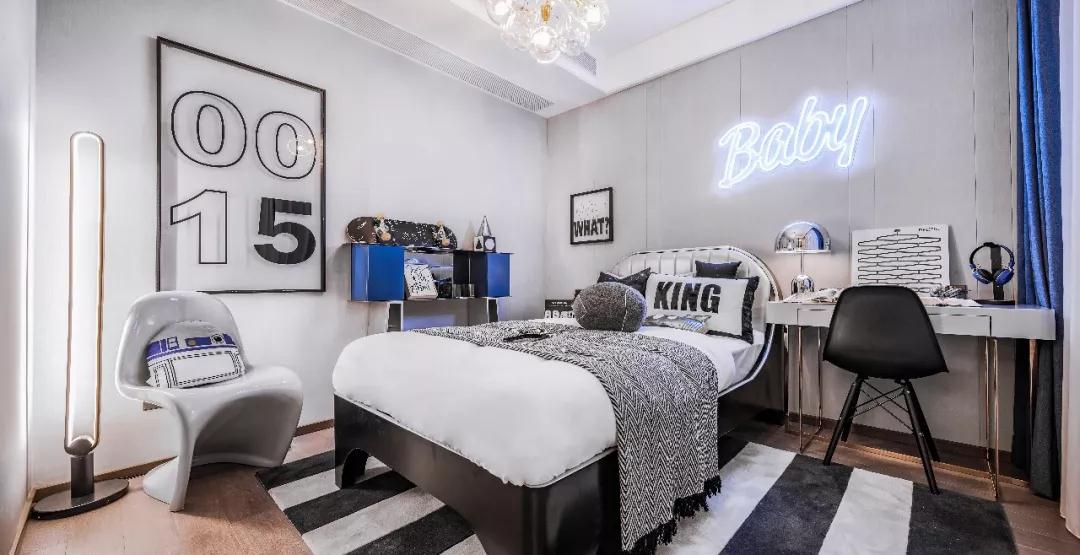 兒童房以藍白灰為主色調,藍色代表對未知的幻想,白色代表單純童趣,灰色則代表個(gè)性,不會(huì )太張揚,活潑中帶有一絲寧靜,設計不僅注重童趣,也增添了藝術(shù)和興趣的培養氛圍,以滑板,運動(dòng)為主題,輔以音樂(lè ),游戲功能,充滿(mǎn)了歡快輕松的調性。