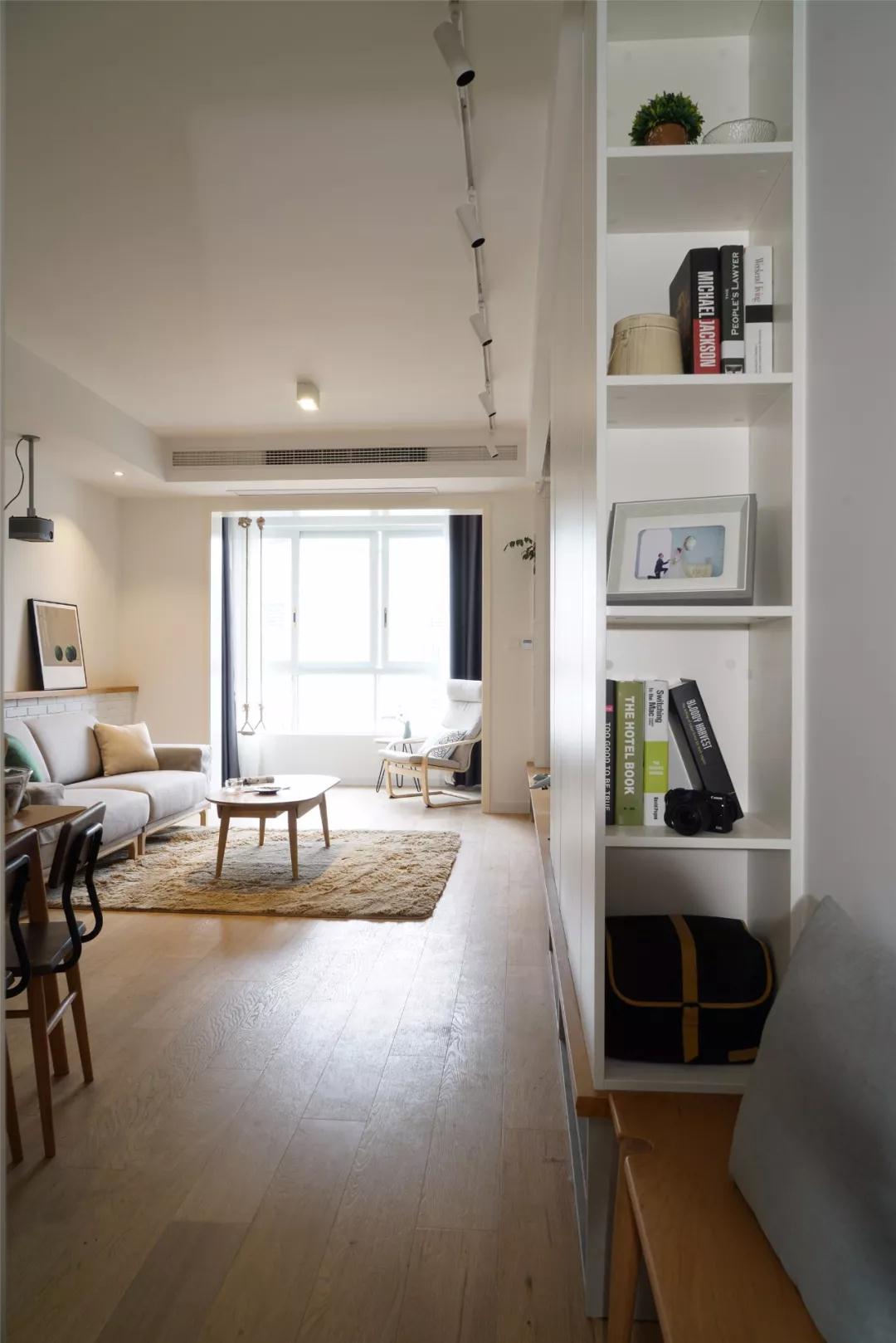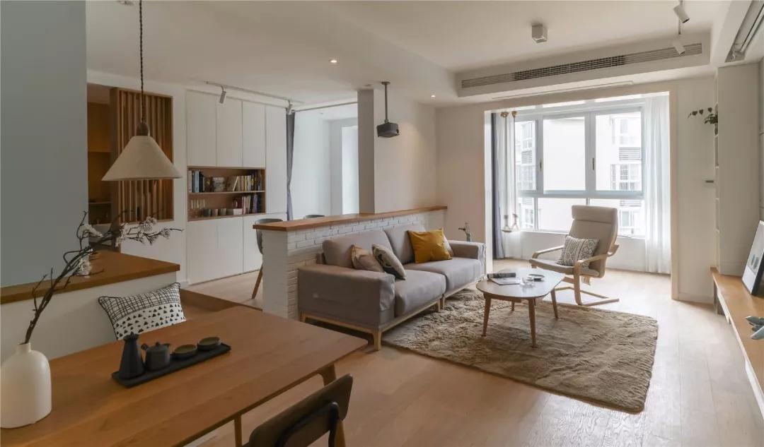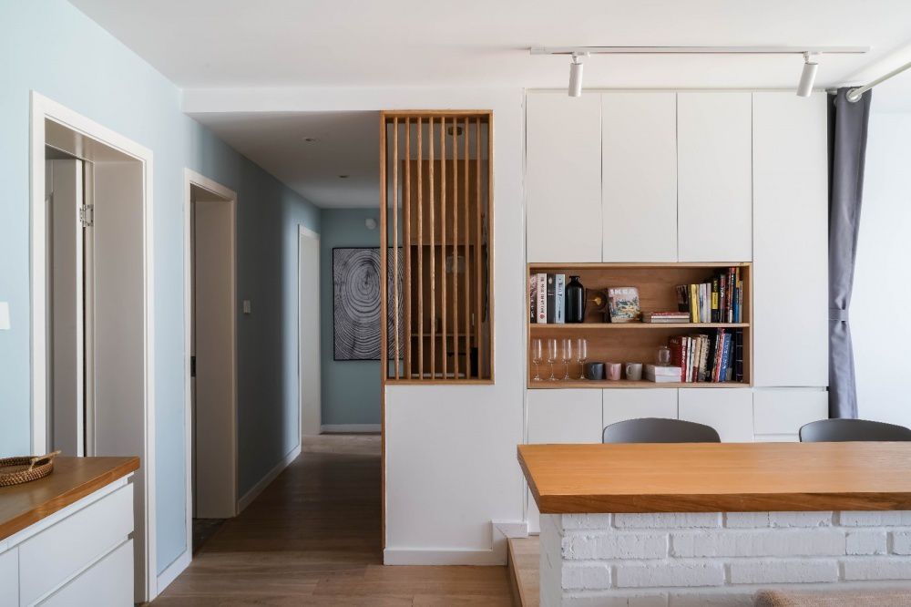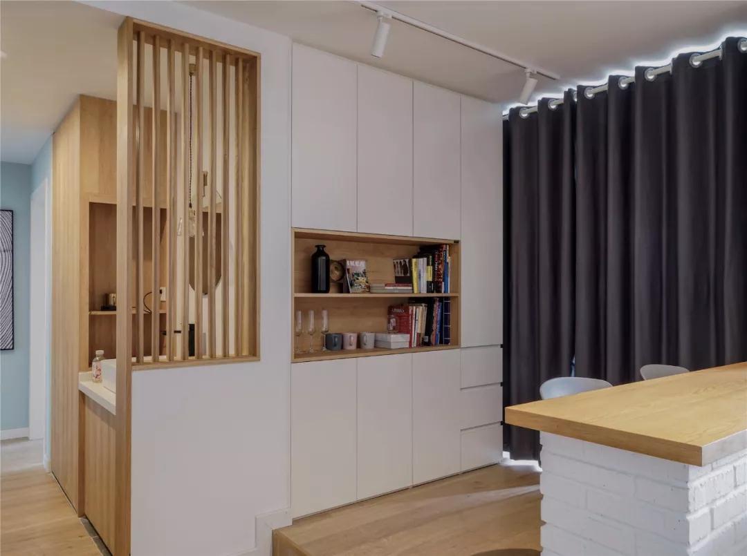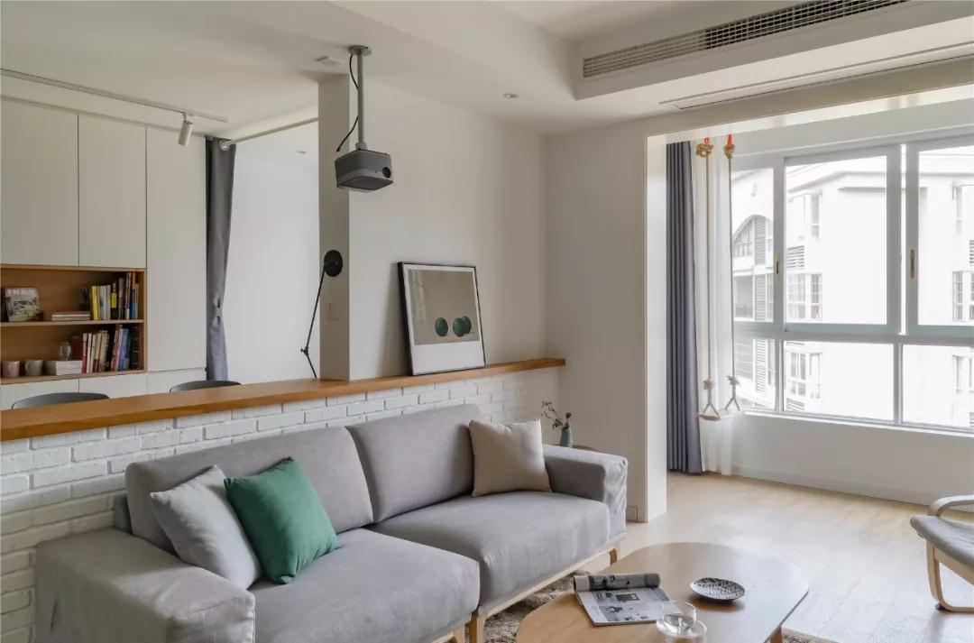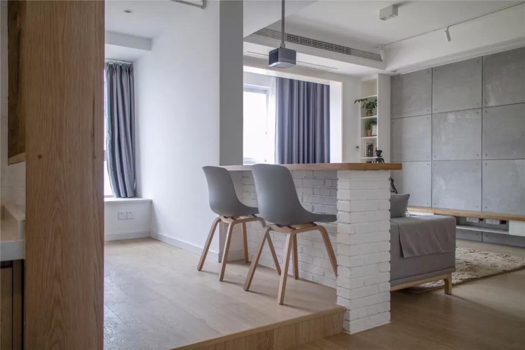 ▲ 客廳與書(shū)房打通并以矮墻吧臺隔開(kāi),帶給了客餐廳額外的采光,原本短促的視野也幾乎增長(cháng)了一倍,顯得寬敞了許多。