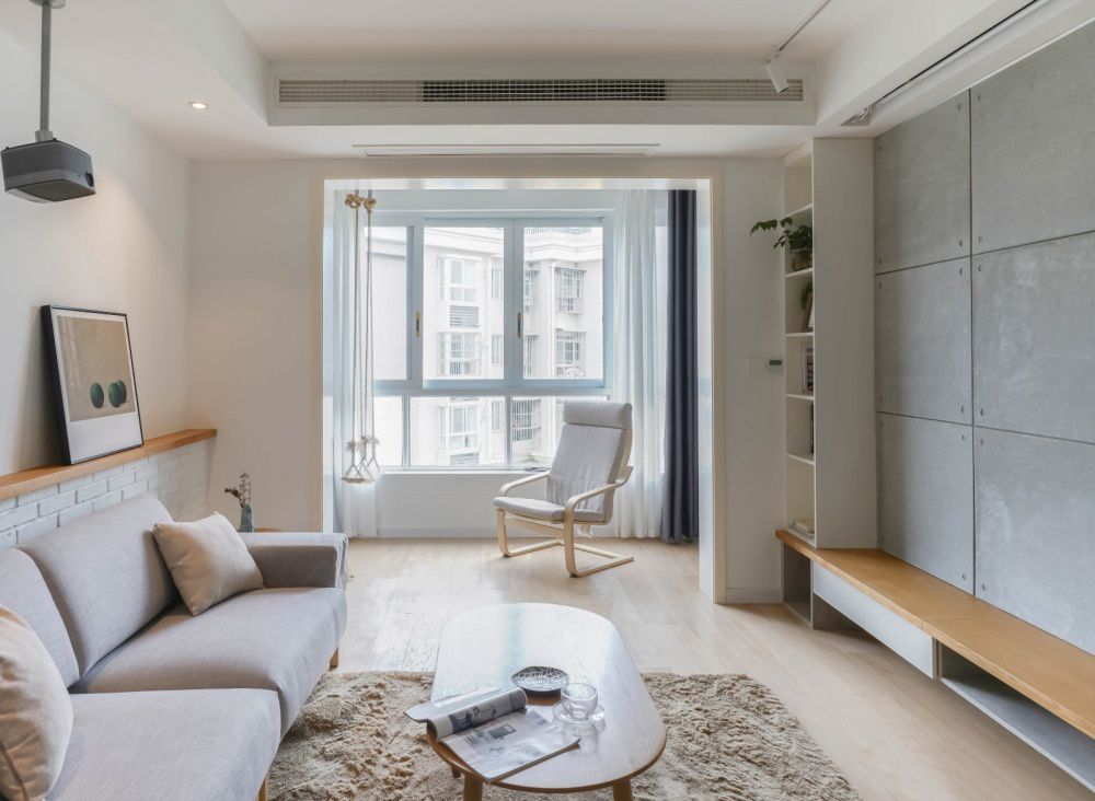 ▲ 矮墻以白色文化磚打造,木質(zhì)臺面延伸至旁邊的高墻,可以擺放裝飾畫(huà)與小擺件?;疑妓嚿嘲l(fā)靠墻而置,簡(jiǎn)約又舒適。