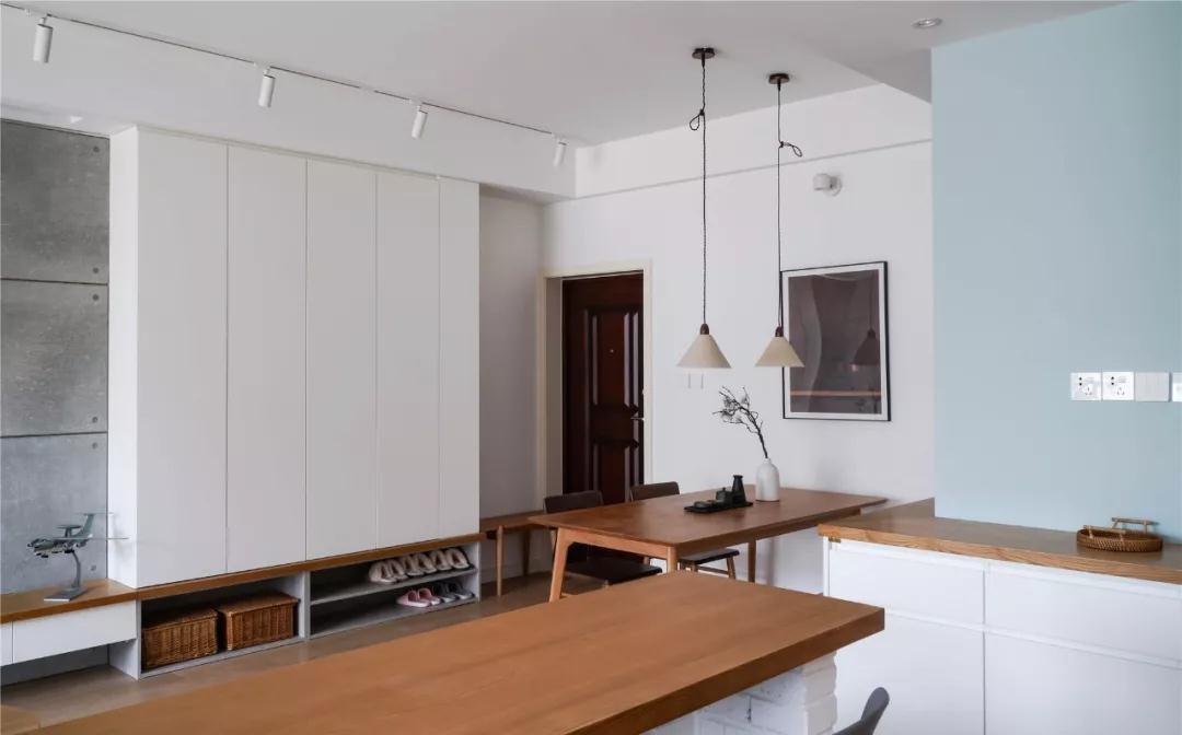 ▲ 至頂的白色定制柜體兼具餐邊柜與鞋柜的功能,大面積的儲物設置便于保持空間的干凈整潔。