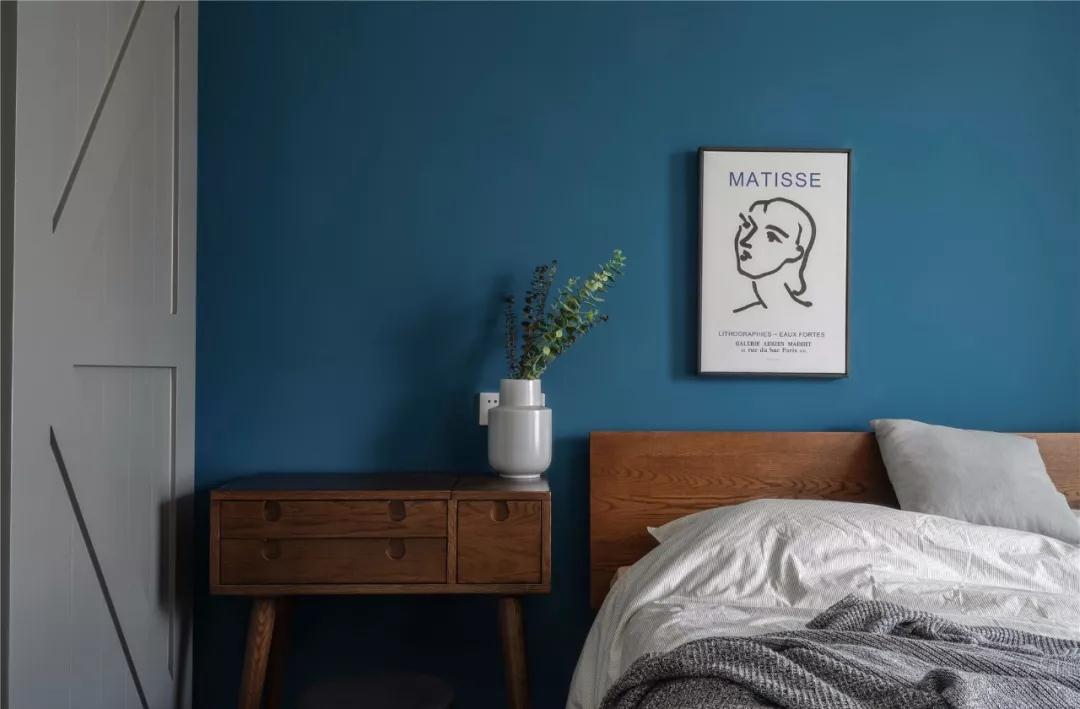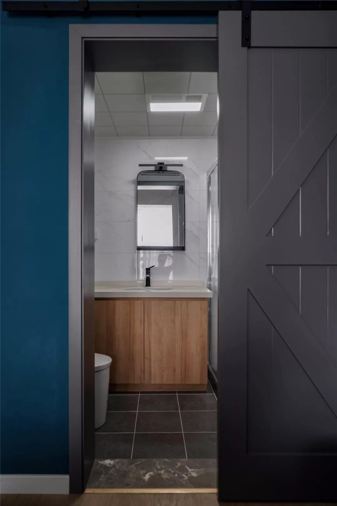 ▲ 深藍色的墻面搭配灰色床品與谷倉門(mén),營(yíng)造沉靜而優(yōu)雅的睡眠氛圍。