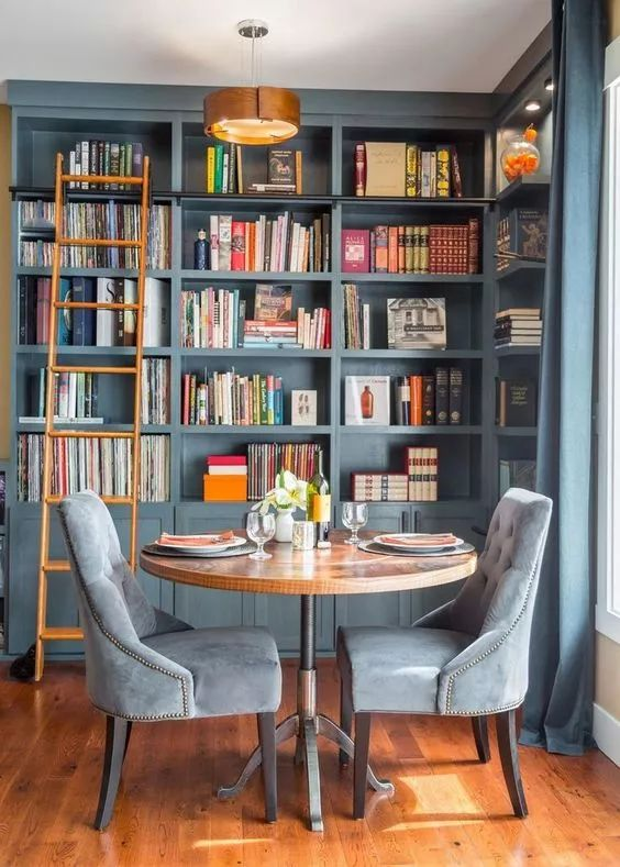 房間的轉角是最難利用的空間,做成嵌入式的書(shū)柜,即保證了藏書(shū)空間的整體性,又可以將死角利用的恰到好處。如果層高過(guò)高,可設計一個(gè)梯子,方便拿取放于上層的書(shū)籍。搭配一個(gè)舒適的沙發(fā),可以令角落也有情調。