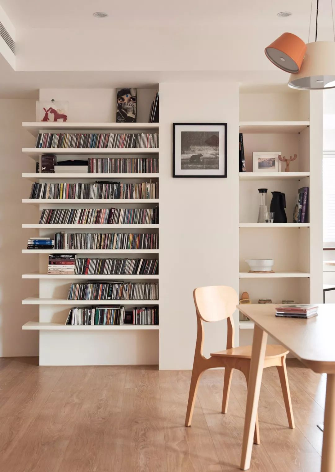 如果家里有樓梯,把書(shū)架做在樓梯的內側也是一個(gè)很不錯的想法。這樣就更有一種藏書(shū)閣的感覺(jué)了。形式可以做不同大小方盒固定式,也可以做成落體式的,都很漂亮。