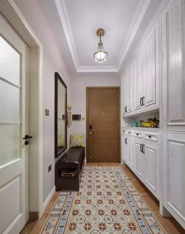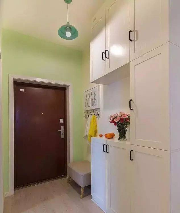 如果家里面的鞋子量很大的話(huà),建議設計鞋柜應該首先考慮容量,那種頂天立地的大面積鞋柜比較適合。像下面這種:鞋凳、鏡子、衣帽鉤這些都選擇房子鞋柜的對面。