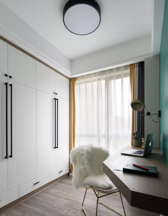 如果臥室狹長(cháng),可以適當添加隔板做成一個(gè)簡(jiǎn)易的L型衣帽間,充分利用每一寸的空間,滿(mǎn)足我們日常盡情換衣的夢(mèng)想,而且能隔開(kāi)睡眠區,讓臥室更具私隱性。